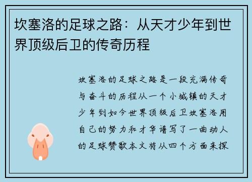 卡塞米罗,这位来自巴西小镇的足球天才,以其卓越的才华和坚韧的精神,从青涩少年逐渐成长为欧洲豪门球队的重要一员。他的故事不仅仅是个人成就的体现,更是一段激励人心的传奇旅程。文章将从四个方面详细阐述卡塞米罗的足球之路,包括他的早期生活与启蒙、职业生涯的发展、在俱乐部中的辉煌表现以及国家队的贡献与荣誉。这些方面共同构成了他作为一名顶级球员的全景,为读者呈现出一个充满激情与奋斗精神的不凡传奇。 1、早期...